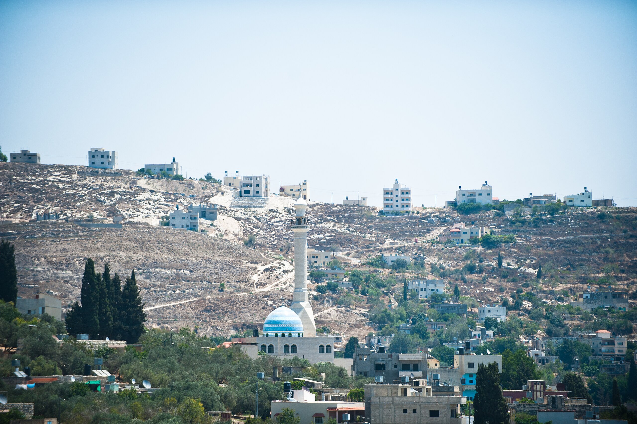 Header image depicts Jewish settlements on a hill above a Palestinian town circa 2011. (Wikimedia Commons)