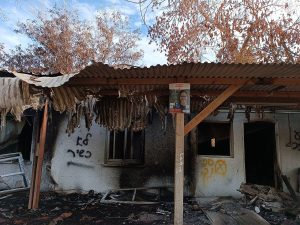 A home in Kibbutz Nir Oz after the 2023 Hamas-led attack on Israel. In the October 7, 2023 surprise attack on the Gaza border communities, Hamas either killed, injured or abducted about one quarter of the 400 residents of Kibbutz Nir Oz.